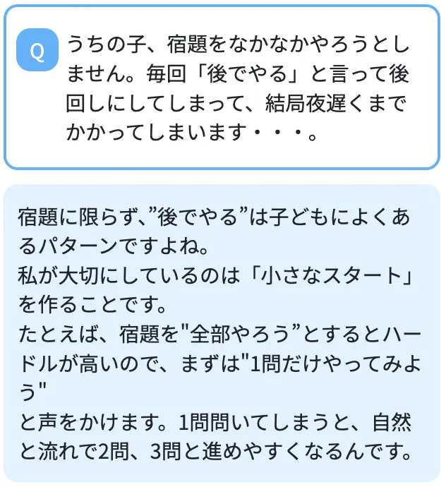学習についての保護者のお悩みを想定した質問に先生が回答。先生の問題解決の仕方や考え方を事前に把握できます。